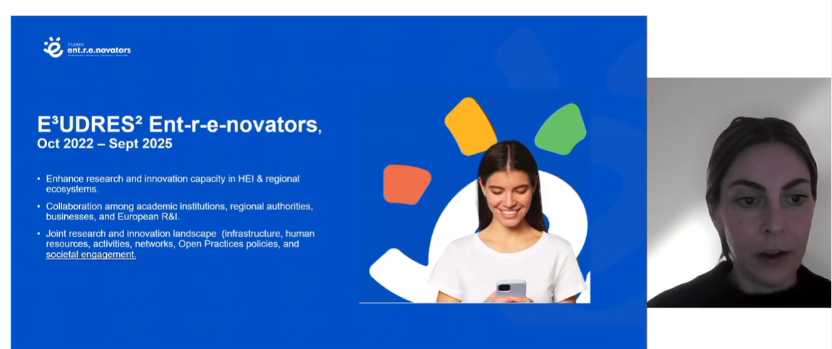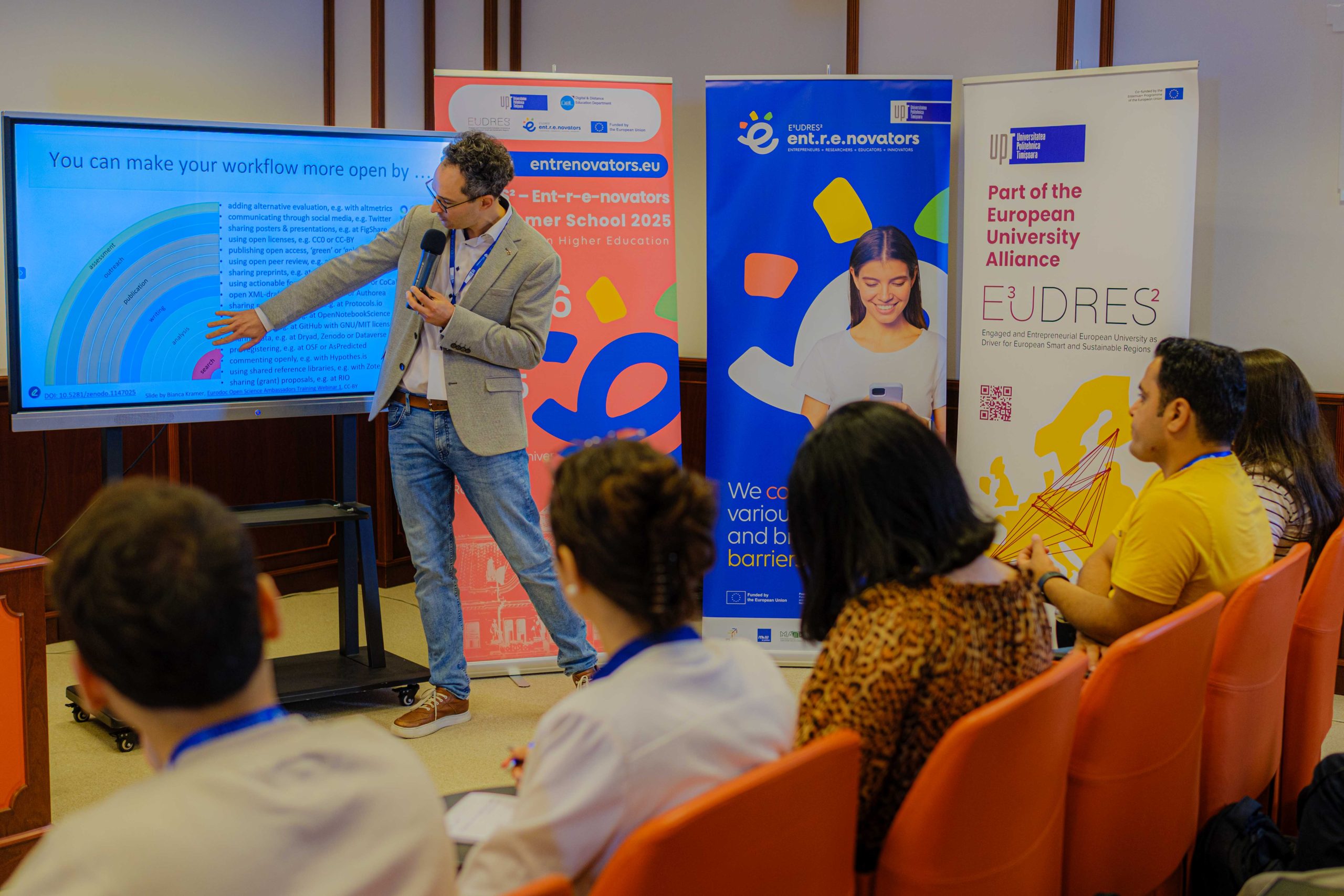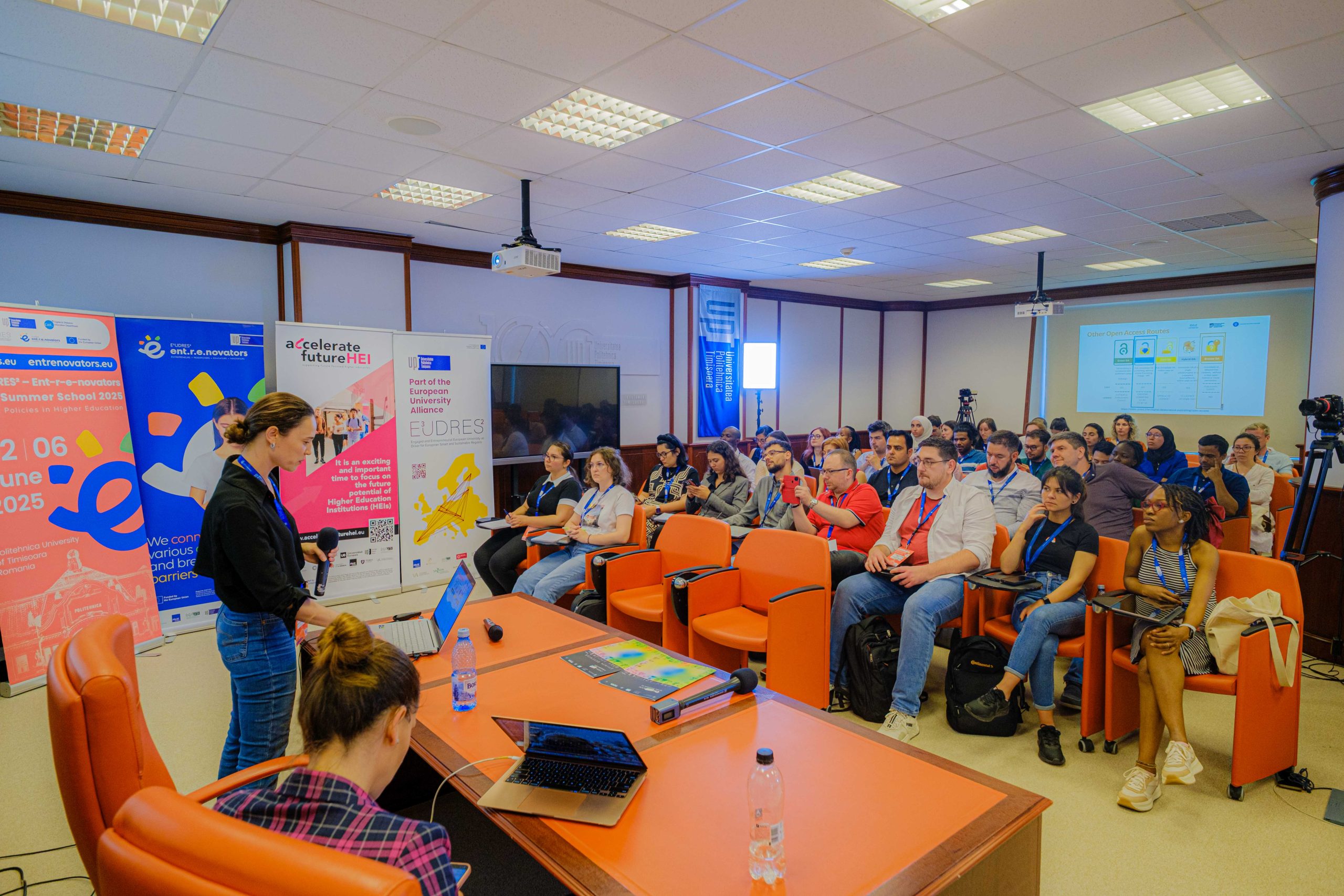 Prima ediție a E³UDRES² – Ent-r-e-novators PhD Summer School 2025 – Open Practices in Higher Education. Evenimentul a reunit peste 70 de studenți internaționali din 22 de țări, iar alți 400 de studenți au participat online prin Zoom. 14 experți internaționali din România, Portugalia, Italia, Belgia, Letonia, Ungaria, Olanda și Austria au susținut o serie de prezentări și ateliere valoroase pe teme legate de educația deschisă, știința deschisă, accesul deschis și inovarea deschisă.