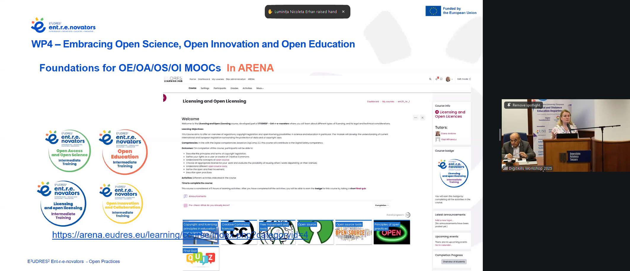 Toate prezentările au fost susținute în limba engleză. După încheierea cursurilor de vară, studenții au primit certificate oficiale de participare, recunoscute pentru 2 credite ECTS, validate de UPT, pentru activitățile desfășurate atât în Timișoara, cât și online. În plus, participanții au primit și două certificate digitale deschise: unul pentru finalizarea cursurilor MOOC (Massive Open Online Courses) axate pe licențiere și licențiere deschisă, și un al doilea certificat digital deschis care confirmă finalizarea modulelor de învățare pe noua platformă Arena Hub E³UDRES².