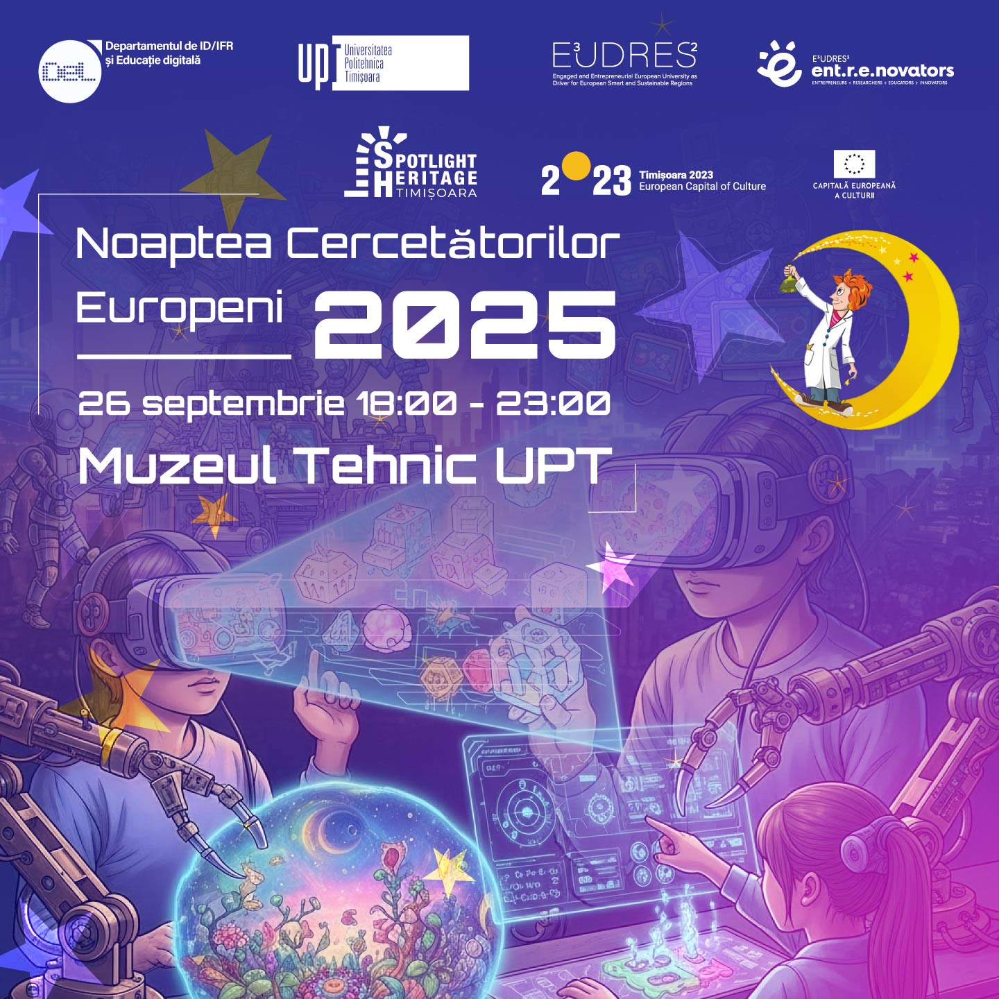 Universitatea Politehnică Timișoara prin Departamentul de ID/ IFR și Educație digitală, împreună cu Centrul Multimedia și alături de proiectul cultural Spotlight Heritage Timișoara, invită pe toți cei interesați să participe la o nouă ediție a evenimentului Noaptea Cercetătorilor Europeni în 2025!