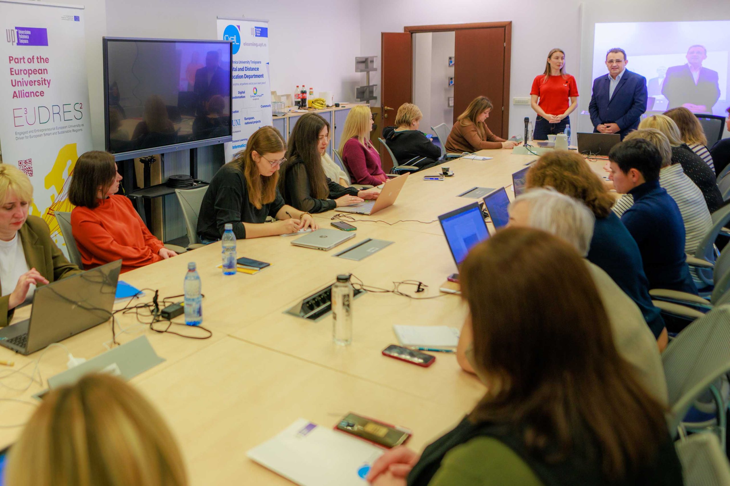 DeL a găzduit reprezentanți de la UCLL University of Applied Sciences (Belgia) și St. Pölten University Of Applied Sciences (Austria), parteneri E³UDRES², pentru a dezvolta module educaționale comune sub formă de micro-credințiale. Aceste module vor fi integrate într-un viitor program de master și vor pune accentul pe dezvoltarea competențelor avansate de comunicare și interculturale, esențiale pentru mediile de afaceri moderne, în linie cu cerințele Industriei 5.0. Din partea UPT au participat Prof. Dr. Ing. Radu Vasiu, Prof. Univ. Dr. Anca Drăghici, Conf. Dr. Ing. Vlad Mihăescu, Dr. Ing. Diana Andone și Ing. Paul Stiegelbauer.