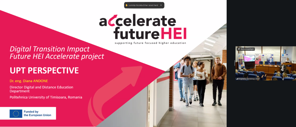 Cea de-a X-a ediție a Workshop-ului Internațional Competențe Digitale 2025 a fost organizată cu sprijinul proiectului Accelerate Future HEI, reunind peste 800 de participanți interesați de dezvoltarea rezilienței în mediul digital. În cadrul evenimentului, Dr. Diana Andone a prezentat impactul proiectului Accelerate Future HEI, evidențiind contribuția acestuia la transformarea UPT într-o instituție inovatoare și antreprenorială.