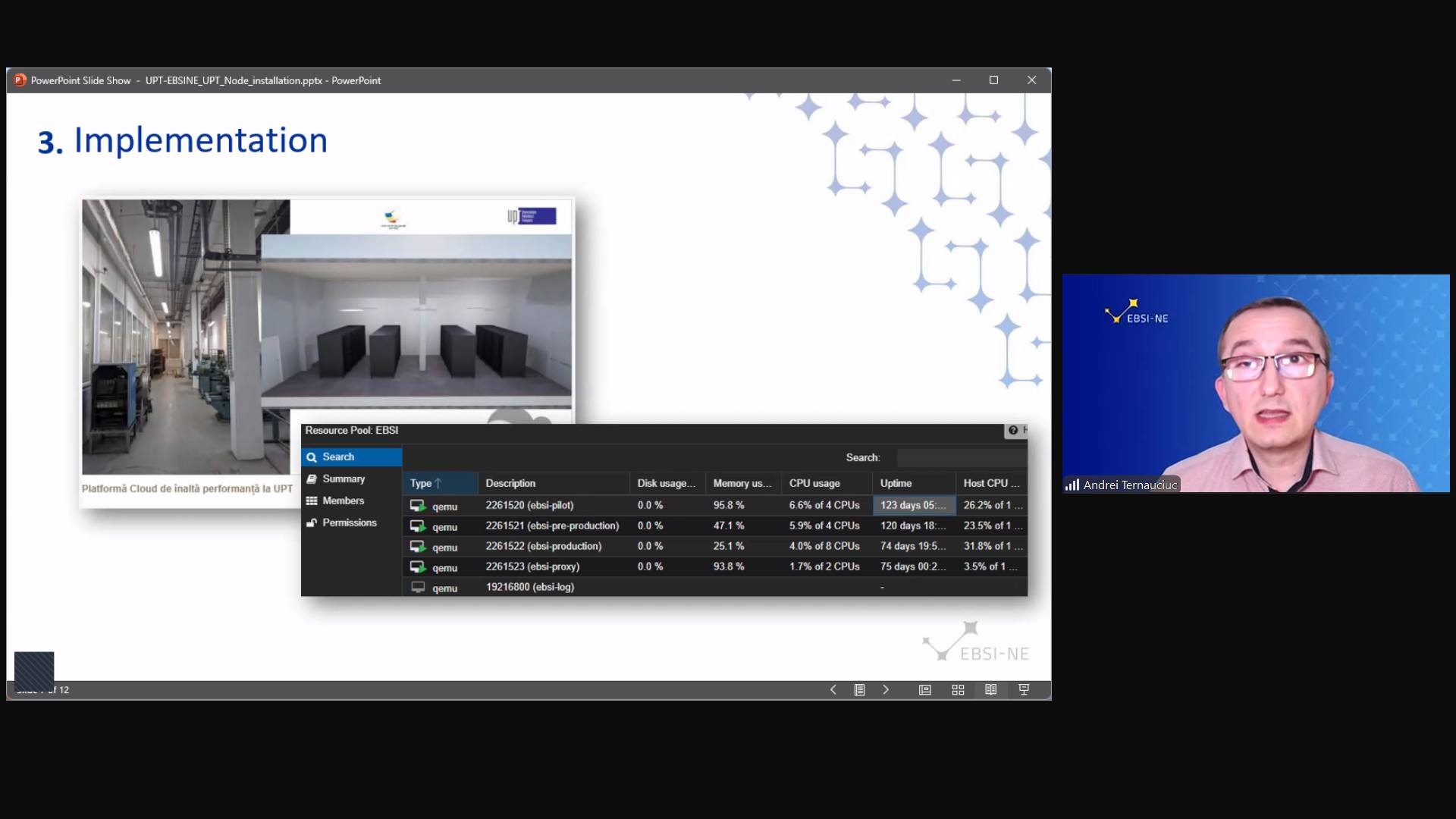 Detaliile tehnice privind instalarea și rolul nodurilor EBSI la UPT au fost explicate de ș.l. dr. ing. Andrei Ternauciuc, în timp ce dr. ing. Diana Andone, drd. Victor Holotescu și Cosmin Cioranu au completat prezentările cu informații despre integrarea portofelelor digitale și instrumentele de suport din ecosistemul european.