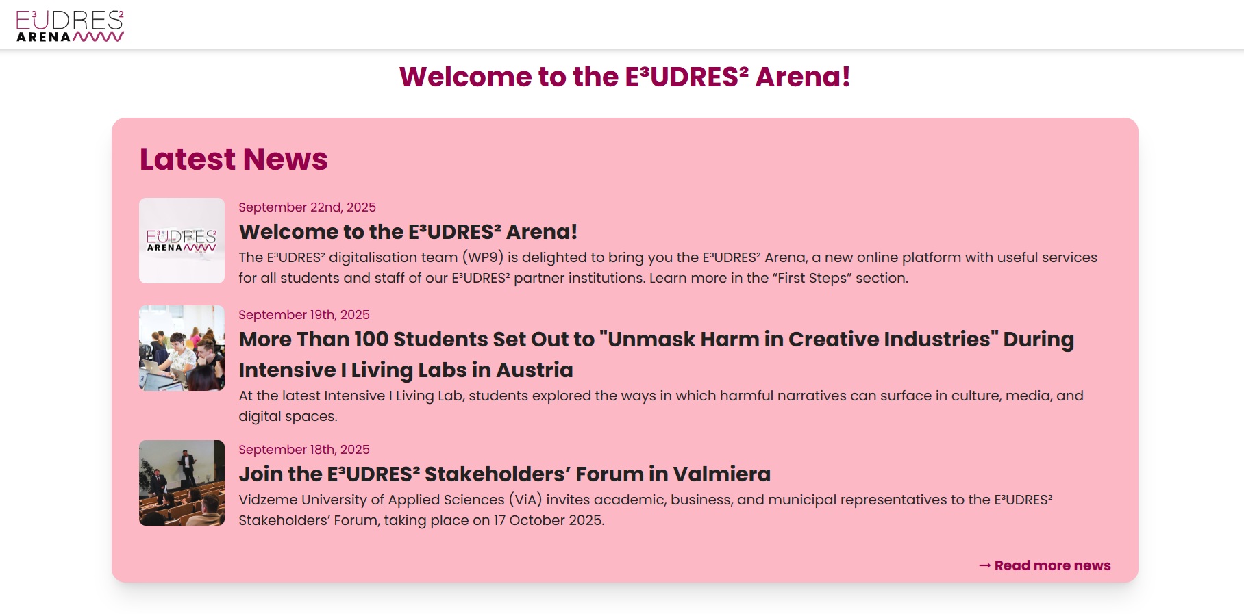 În anul 2025, în cadrul proiectului a fost lansată platforma E³UDRES² Arena, un sistem digital de învățare bazat pe Moodle, care funcționează ca un hub centralizat pentru activitățile Alianței. Platforma facilitează organizarea de cursuri comune, workshop-uri și iLiving Labs, îmbunătățind colaborarea educațională și de cercetare între toți membrii universităților partenere prin instrumente digitale avansate și o interfață multilingvă.